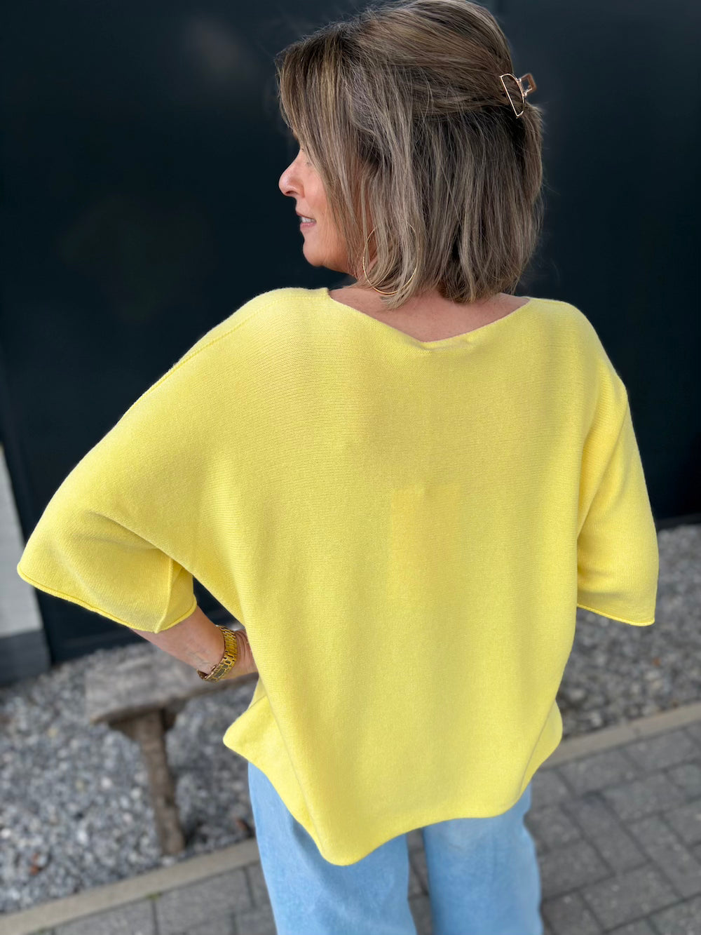 Dit is een wijd model en zeker draagbaar t/m 44. Stop deze top voor wat in je broek of rok voor een nonchalante look.