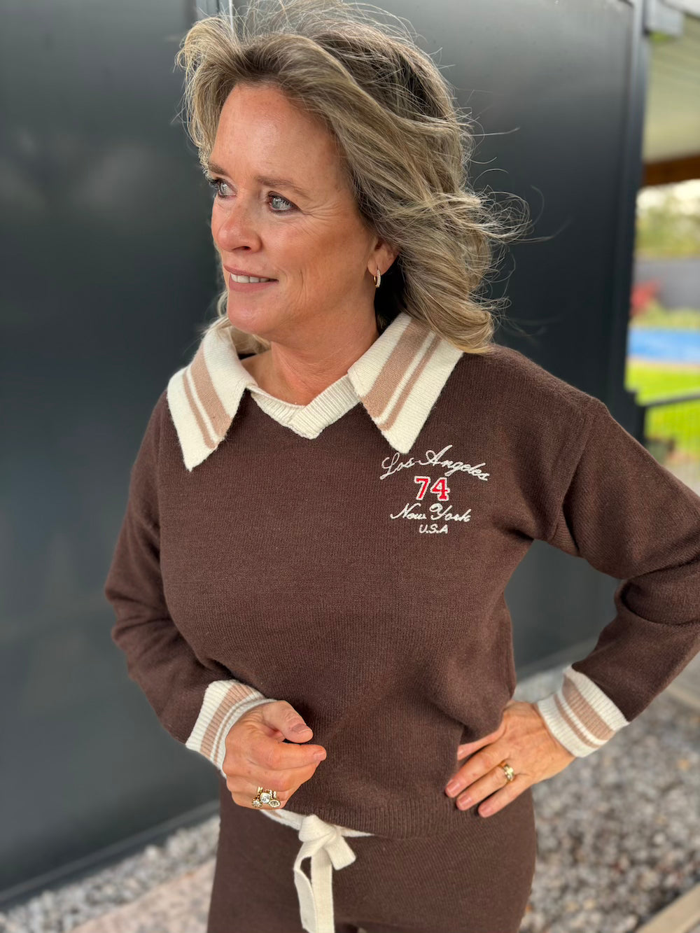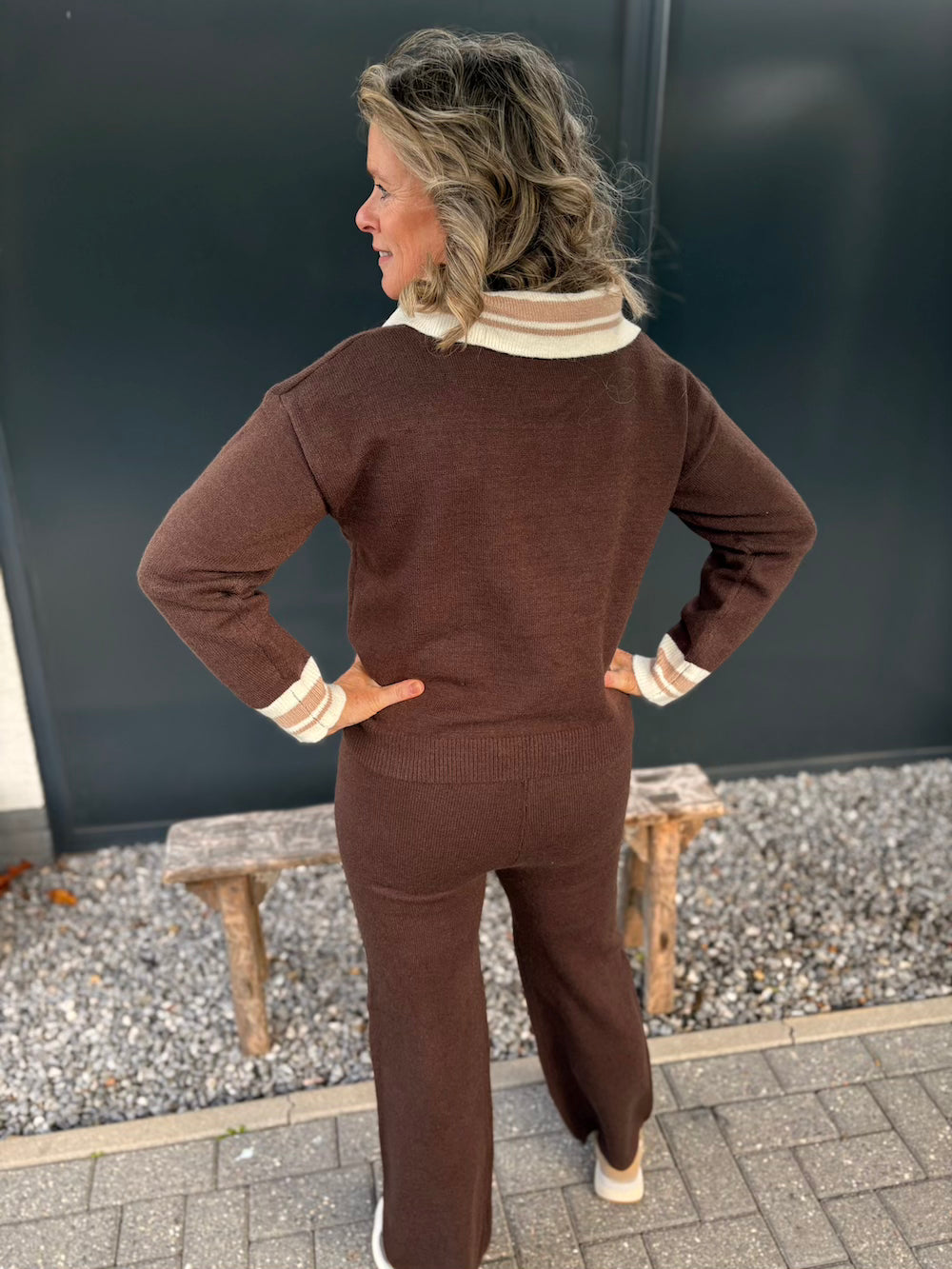 Trendy comfypak van dun gebreide stof met leuke details aan de kraag en manchetten in het crème met beige. Op de borst staat een geborduurd logo en de tailleband van de broek heeft ook een creme met beige boord.