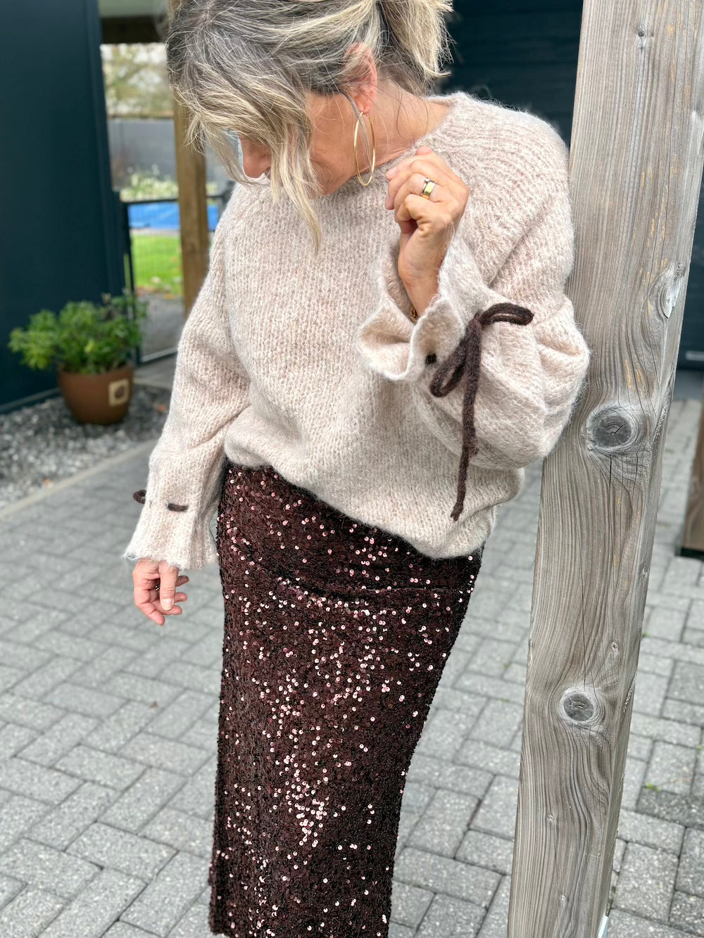 Het sparkle seizoen staat weer voor de deur en deze rok is daarbij onmisbaar. Het leuke van een pailetten rok is dat je deze zowel heel feestelijk kunt dragen met een topje een body of nog meer sparkles maar ook met een leuke knitted trui. Een trui met een klein beetje extra voor een feestelijk effect.