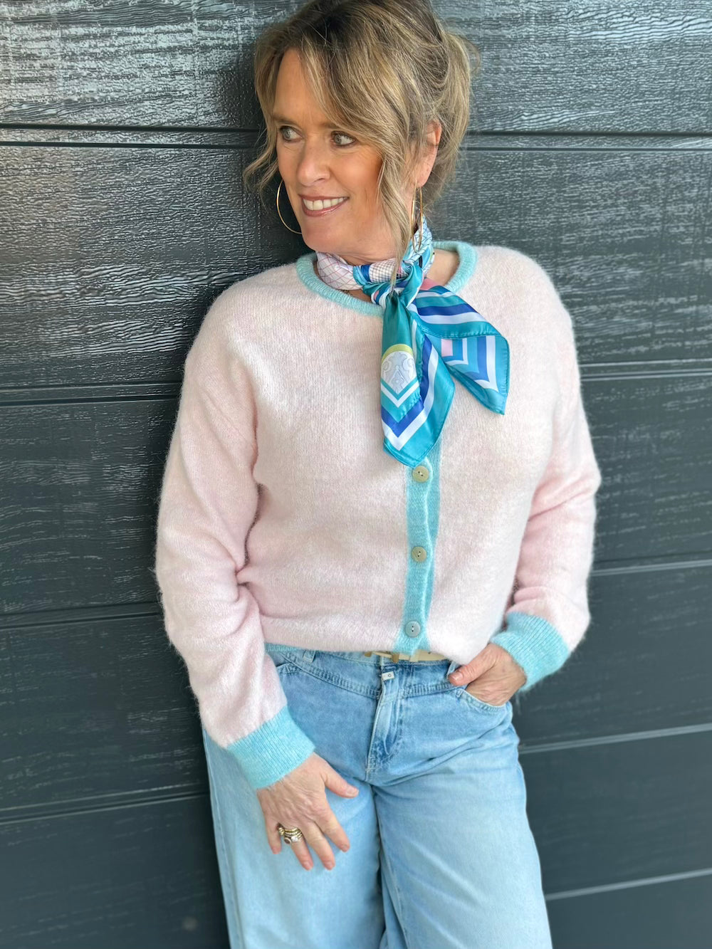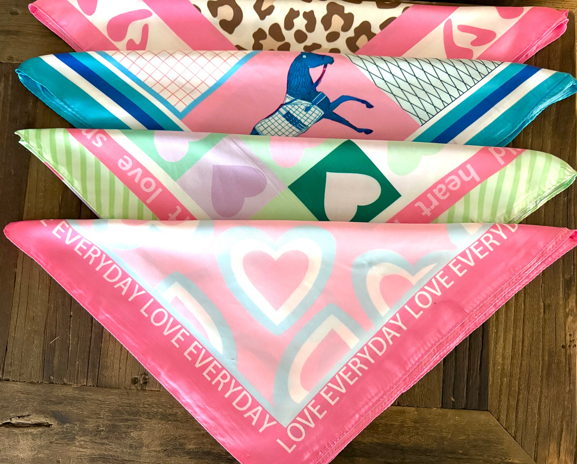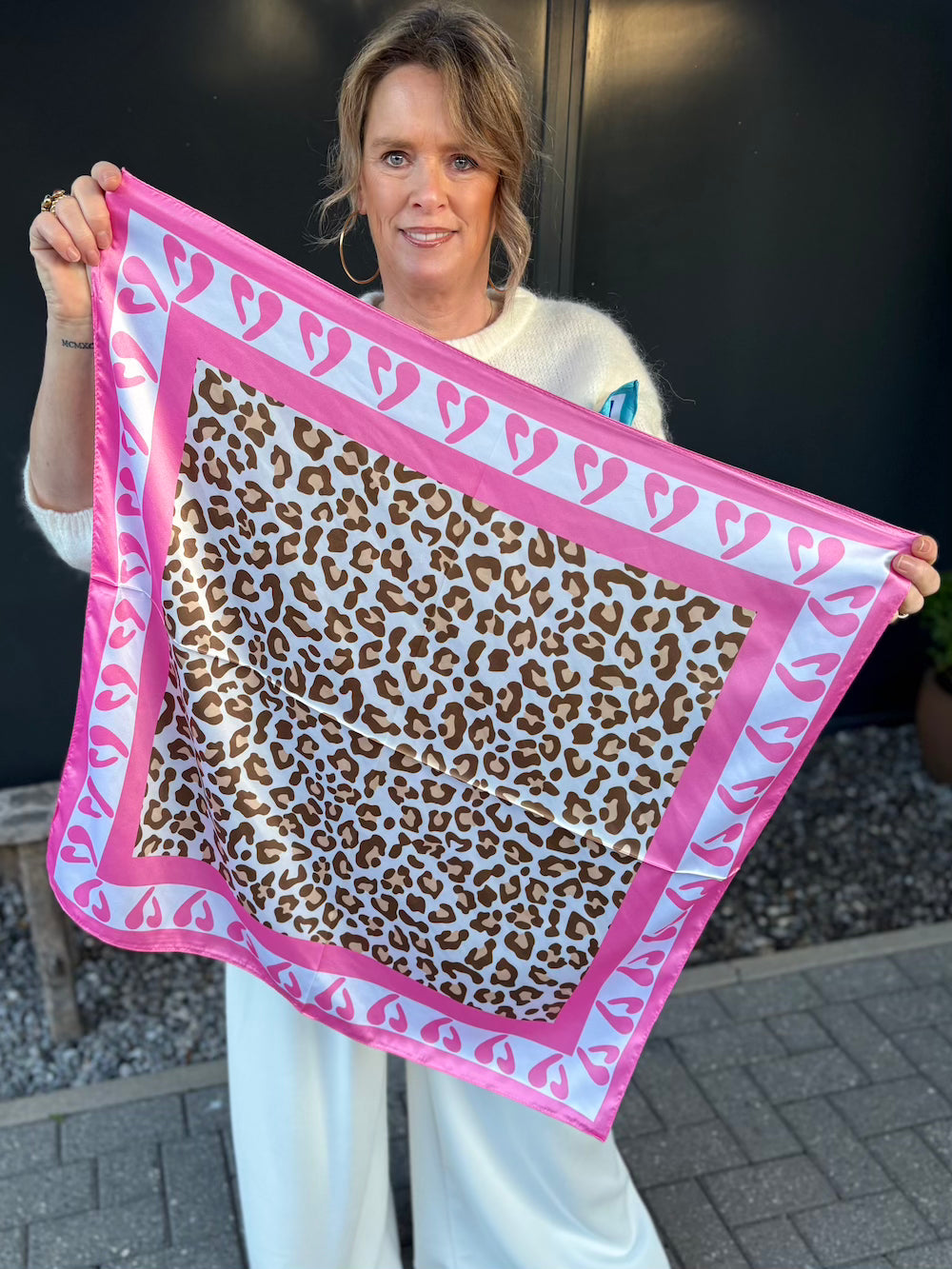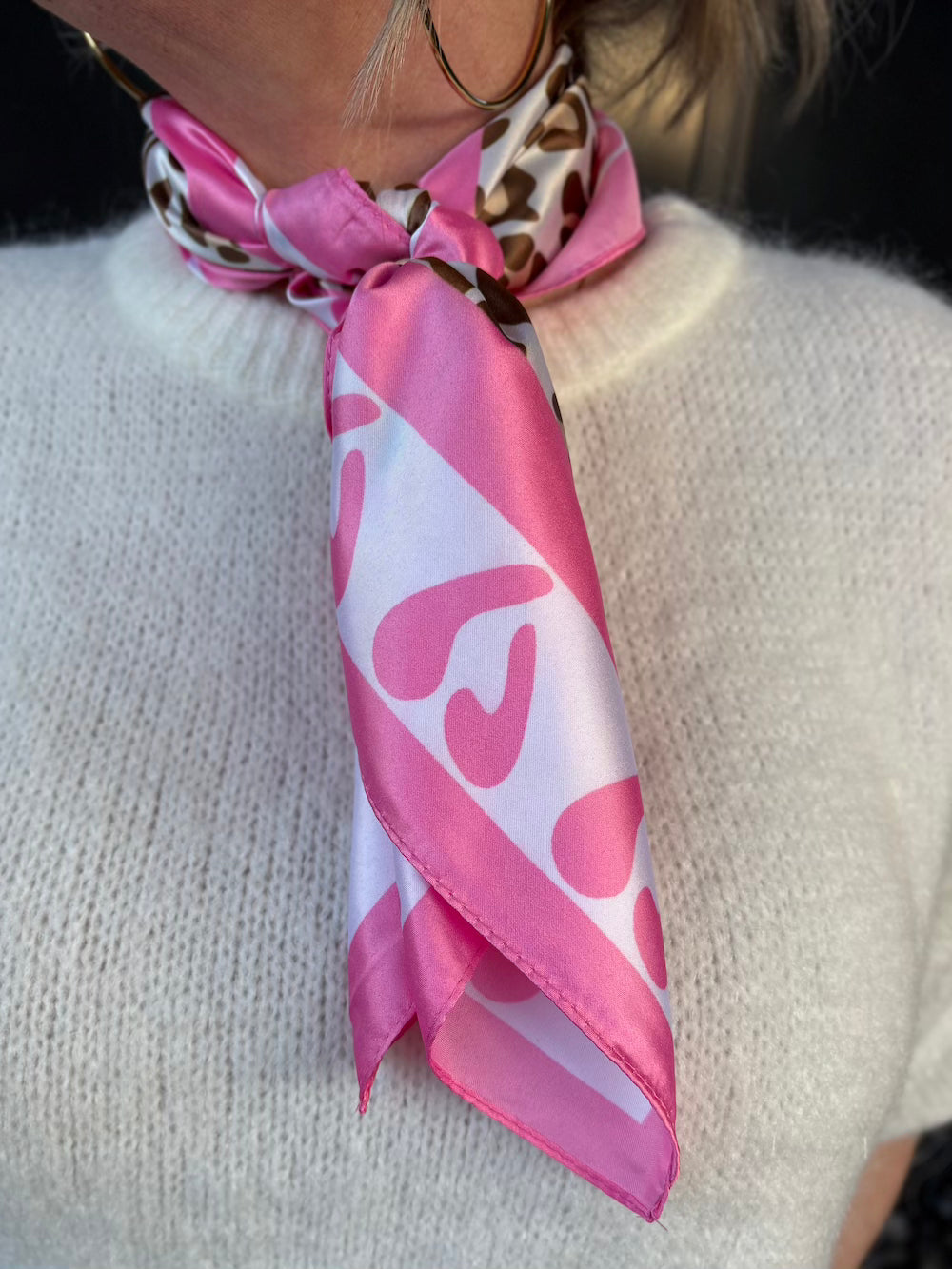 Diverse sjaaltjes in diverse leuke prints, te combineren op een blouse of trui om deze wat op te halen met kleur. Dit sjaaltje kun je ook rond je handvaten van je tasje draaien voor een speels effect.