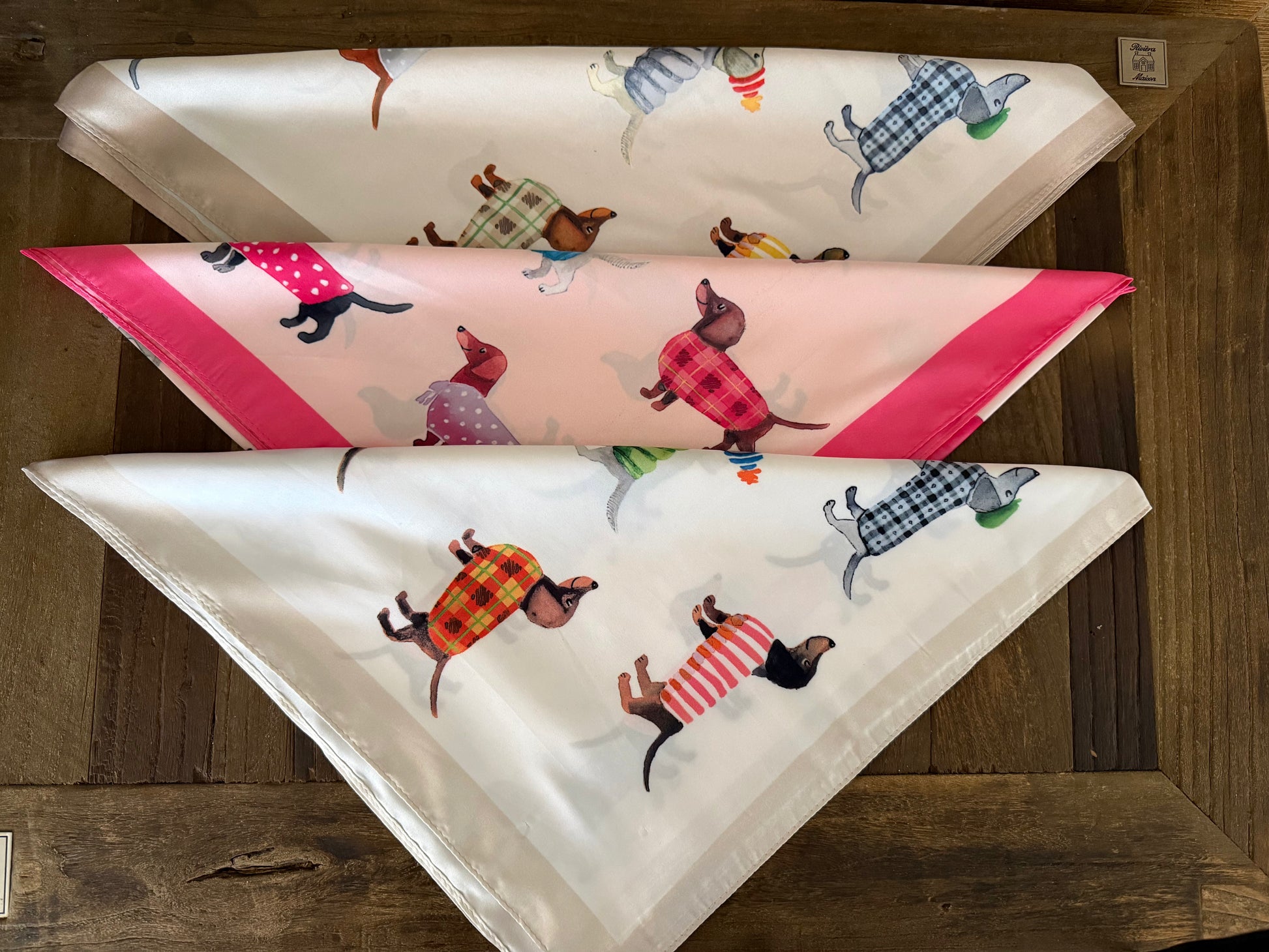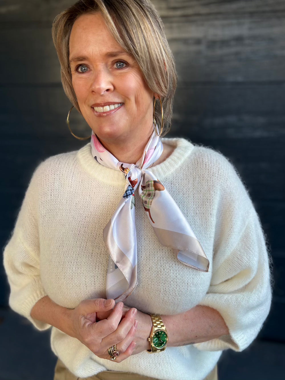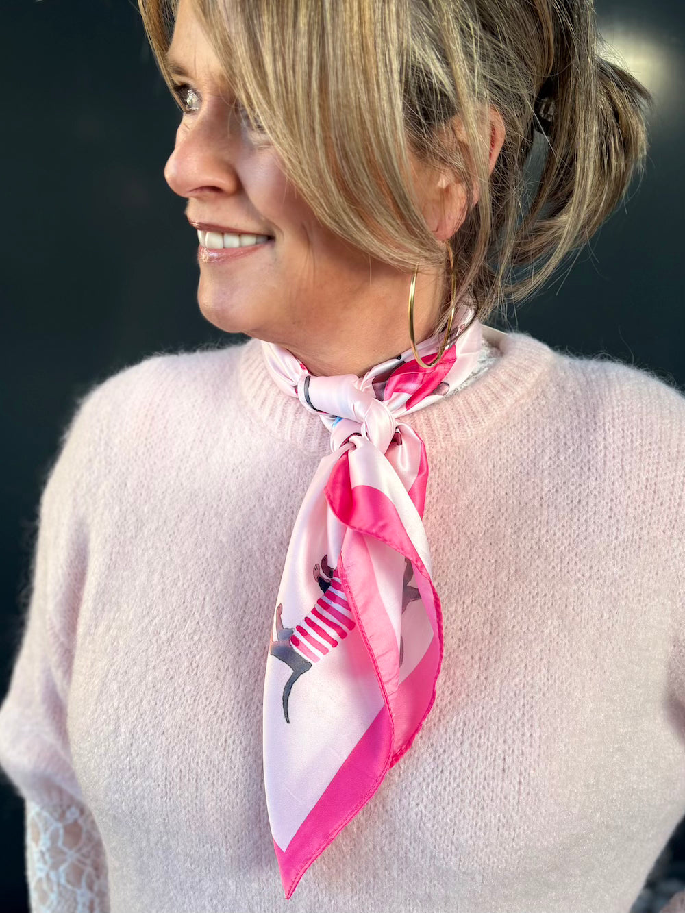 Diverse sjaaltjes in diverse leuke prints, te combineren op een blouse of trui om deze wat op te halen met kleur. Dit sjaaltje kun je ook rond je handvaten van je tasje draaien voor een speels effect.