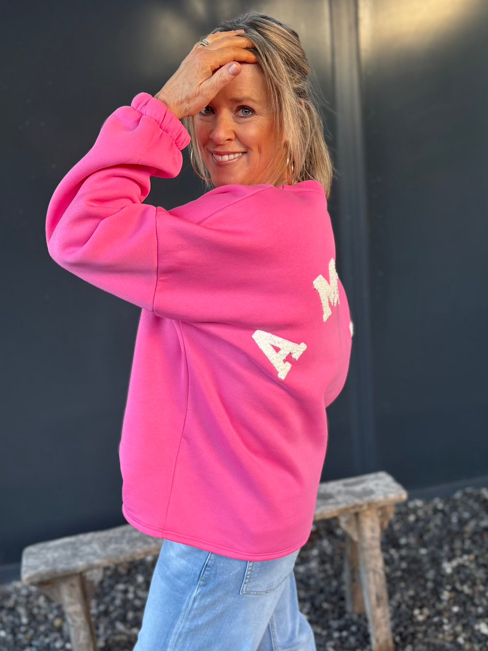Aan vrolijke sweaters geen gebrek dit seizoen en daarom mocht deze vrolijke sweater met applicatie AMOUR niet ontbreken.