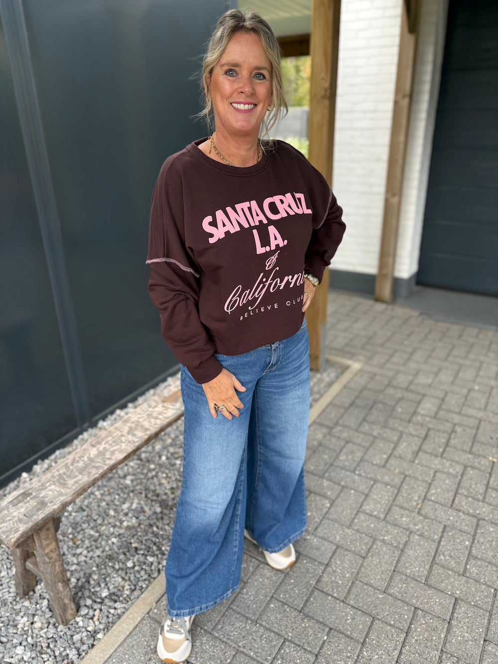 Deze toffe sweater is voorzien van een leuke roze print op het voorpand en valt oversized. Voor een sportieve look is deze heel leuk te combineren met een ballonnen barrel jeans. Deze vind je ook bij ons in de webshop.