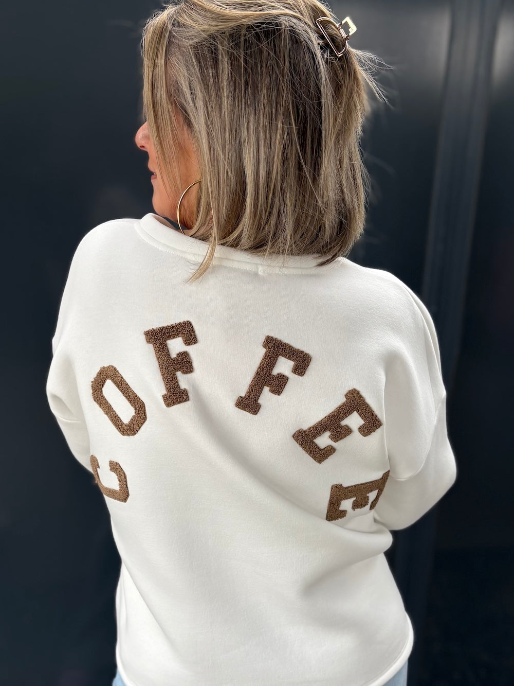 Aan vrolijke sweaters geen gebrek dit seizoen en daarom mocht deze vrolijke sweater met applicatie COFFEE niet ontbreken.