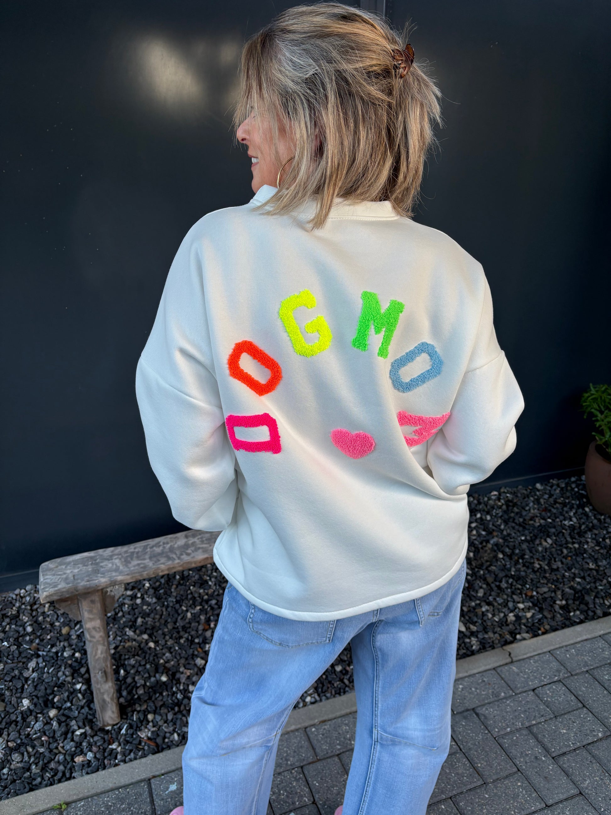 Aan vrolijke sweaters geen gebrek dit seizoen en daarom mocht deze vrolijke sweater met applicatie DOG MOM niet ontbreken.