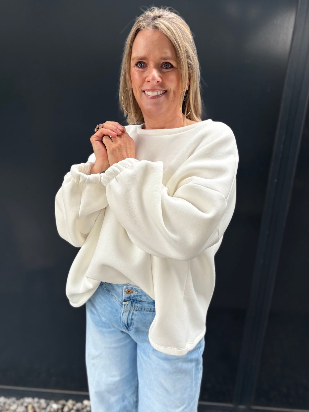 Deze sweater is super oversized en heeft een manchet met elastiek, een lekker nonchalant model dus. Van binnen lekker zacht en warm dus deze draag je vanaf nu!