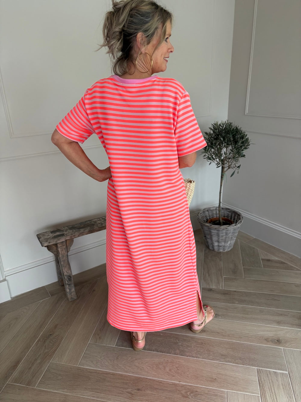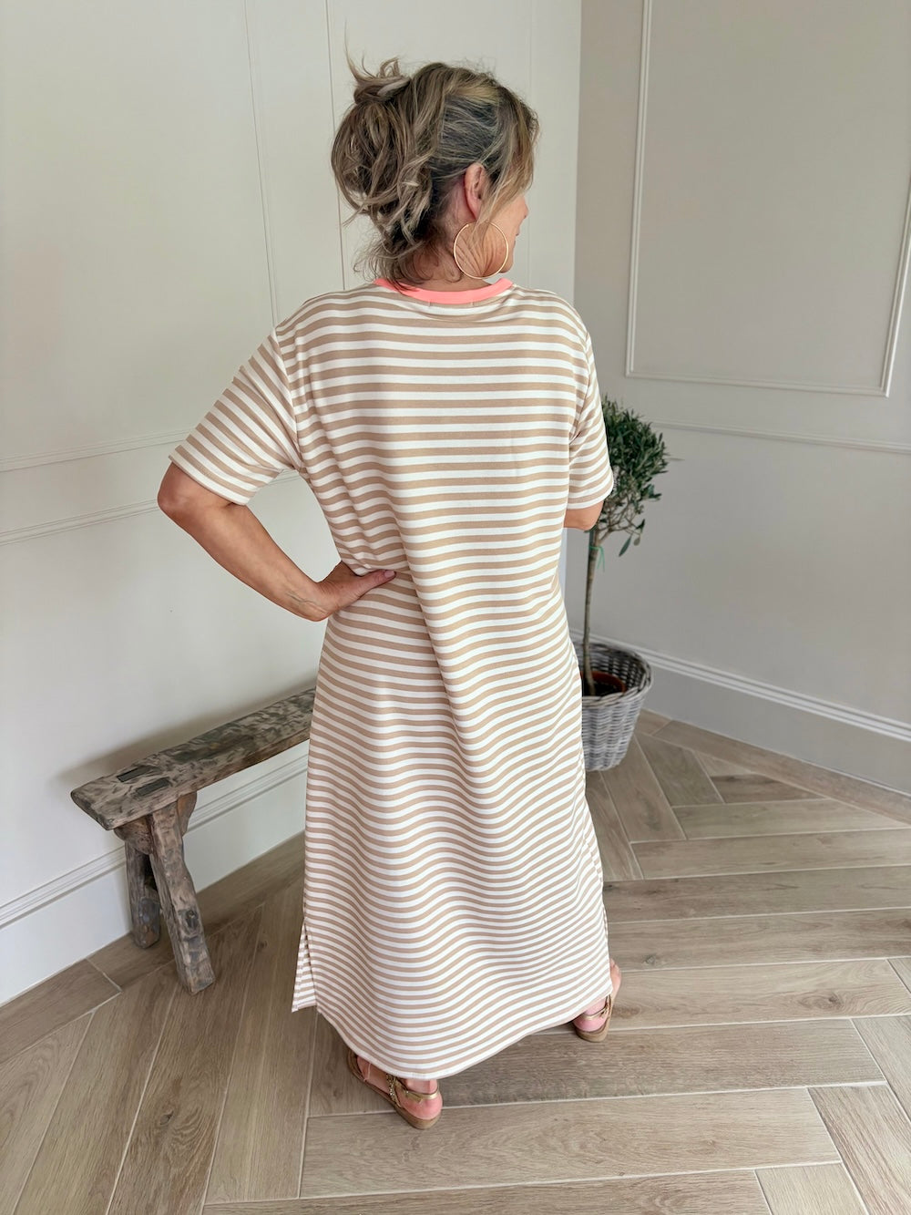 Trend alert! Deze lange sweaterjurk heeft leuke splitjes opzij, als leuk detail heeft de hals een gekleurde bies. Deze jurken draag je meteen met een jeansjasje en later gewoon zo, met een sneaker of een slipper deze jurk is een musthave in je garderobe.