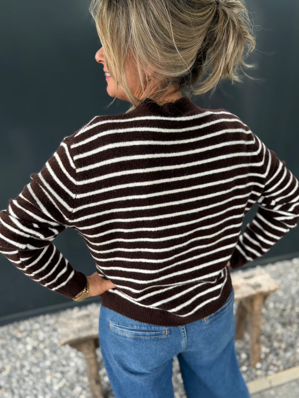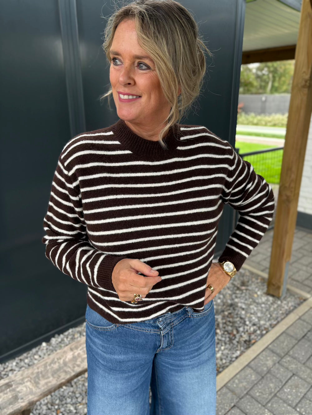 Stripes it is! Deze leuke gebreide trui is ideaal voor de frissere dagen, we hebben deze in verschillende kleurencombinaties en deze kun je overal op dragen.