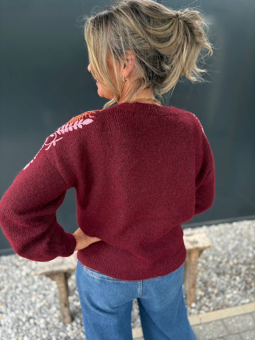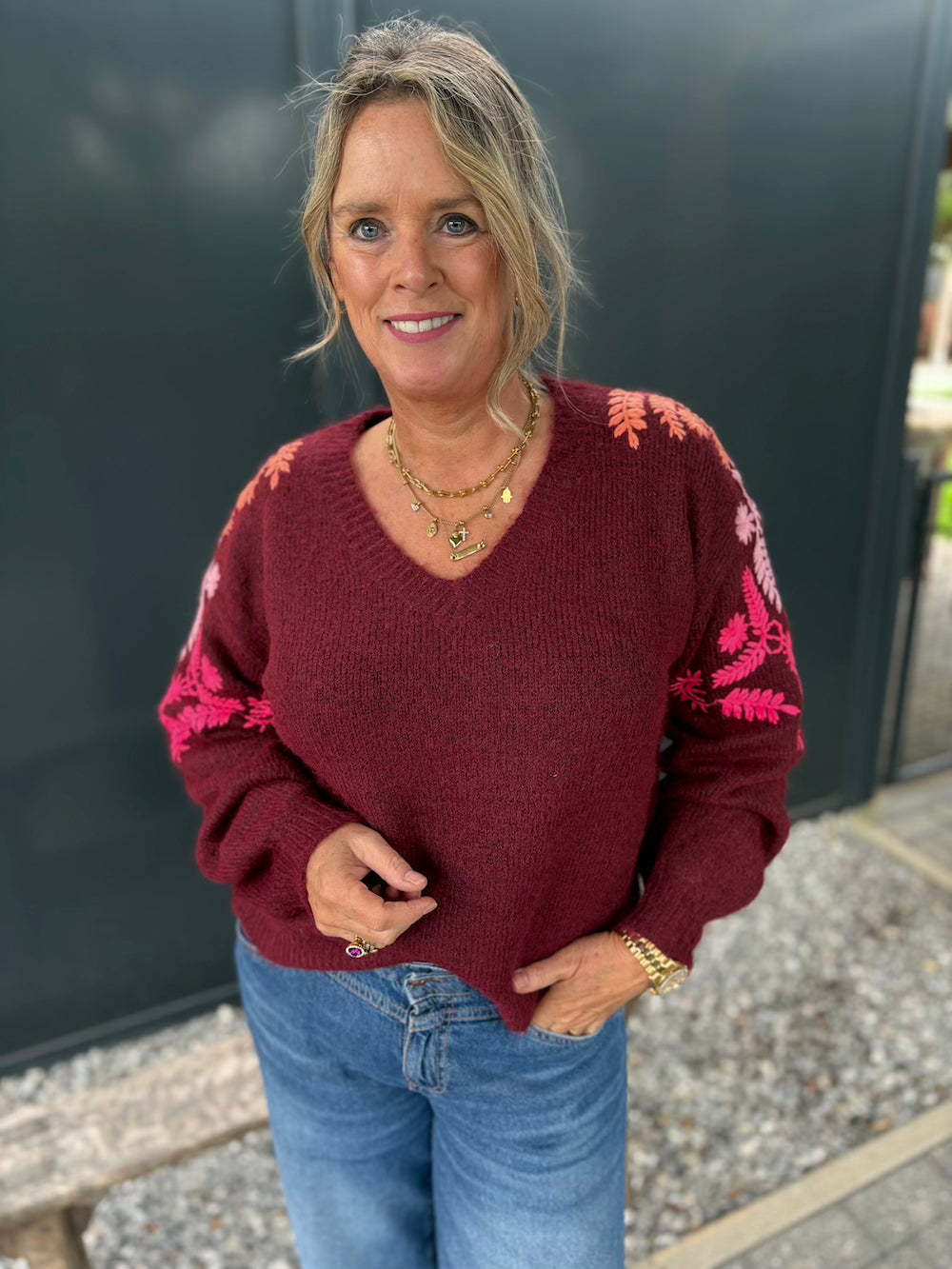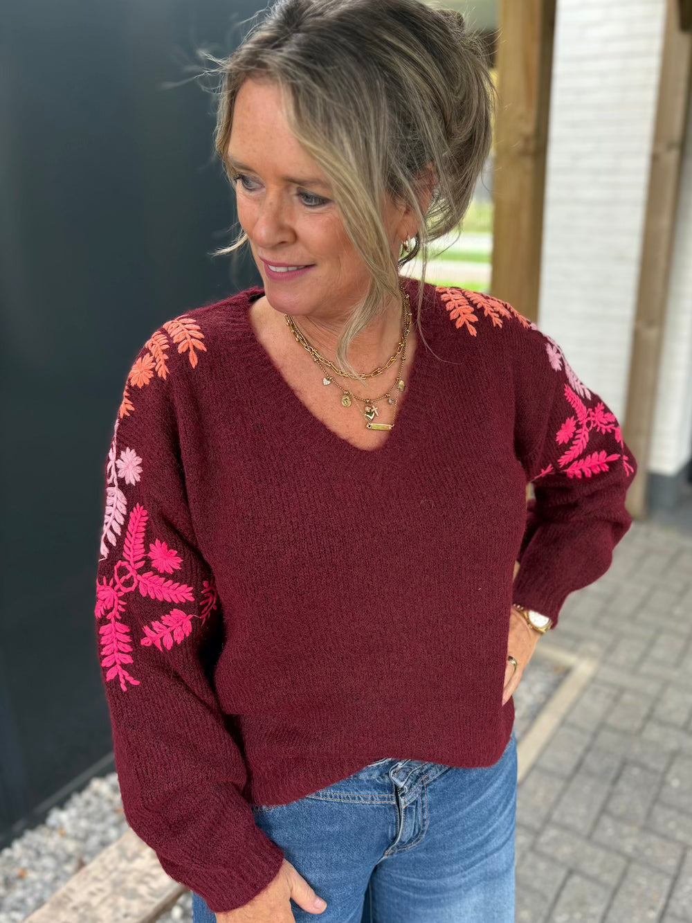 Deze trui heeft weer de leukste details waar wij zo gek op zijn. Een trui met wat extra dus. Deze trui heeft een v hals en deze is niet te diep, de mouwen zijn wijd en daarop zijn gekleurde bloemen geborduurd. Een echte eyecatcher dus. Je draagt deze trui op je favoriete spijkerbroek of op een leuke rok of pantalon, zo kun je met 1 item steeds een hele nieuwe look creëeren.