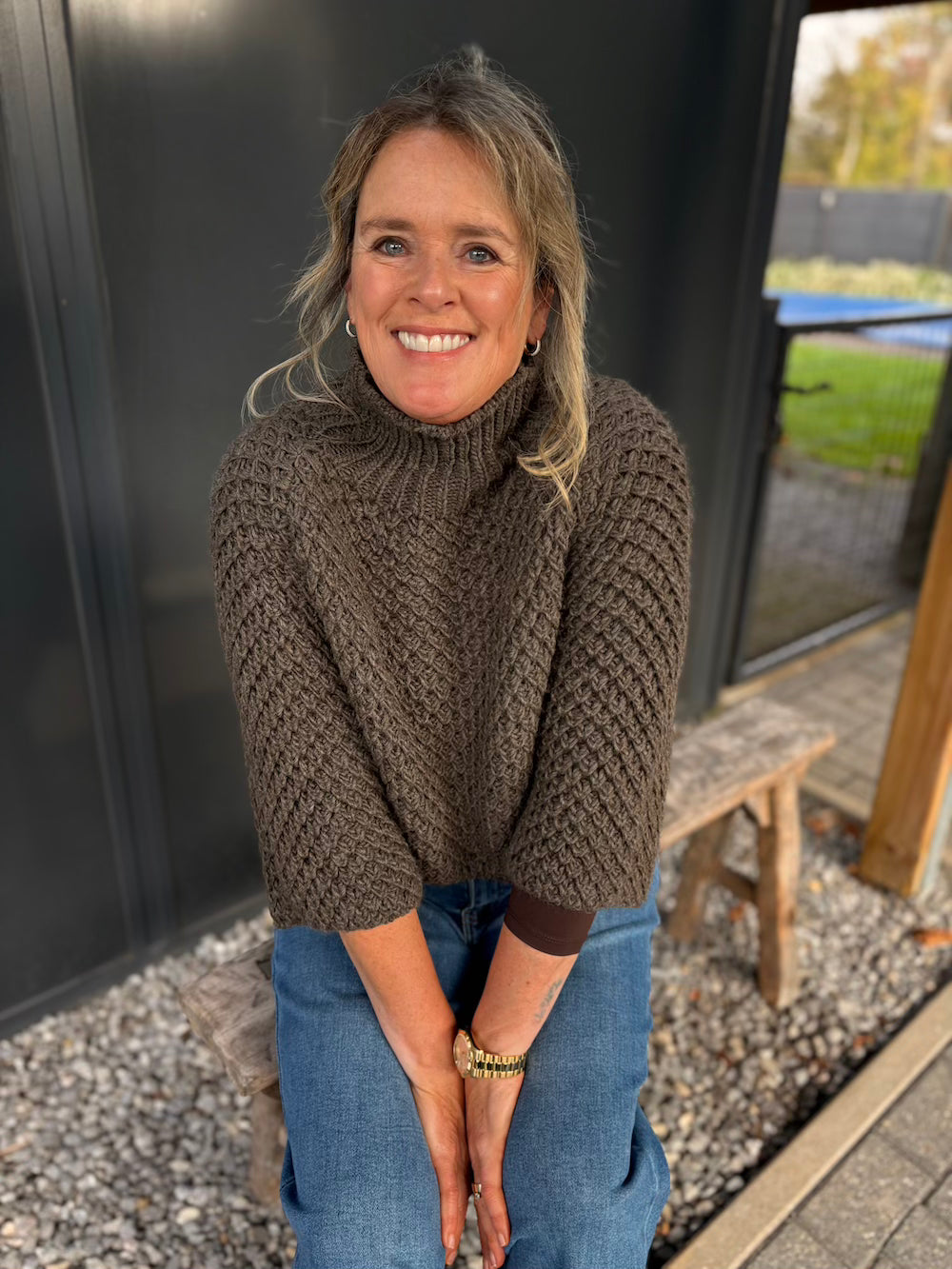 Bereid je alvast voor op de frissere dagen met deze leuke grofgebreide trui met opstaand halsje en 3/4 mouw.