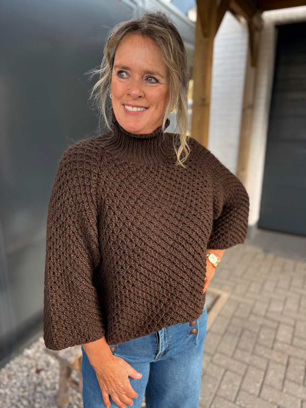 Bereid je alvast voor op de frissere dagen met deze leuke grofgebreide trui met opstaand halsje en 3/4 mouw.
