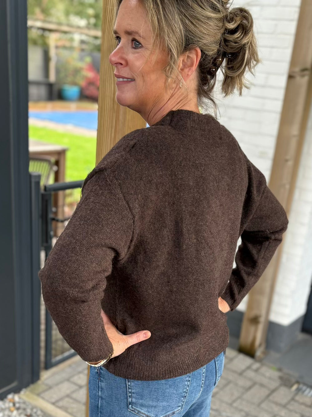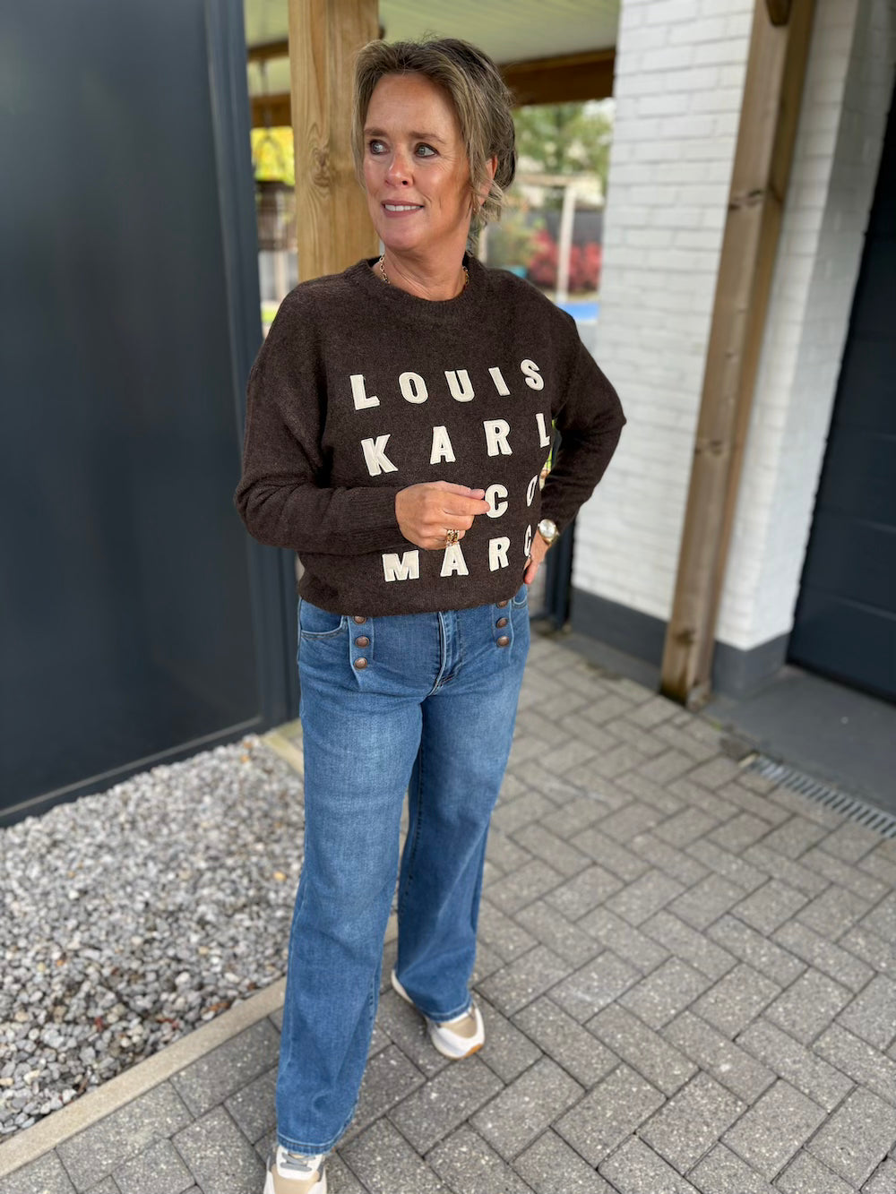 Deze fijn gebreide trui met applicatie met de namen van de grootste designers komt ook uit onze Parijs collectie. De kleurencombinaties zijn volgens de laatste trend en deze trui is natuurlijk weer heerlijk zacht en overal op te dragen.