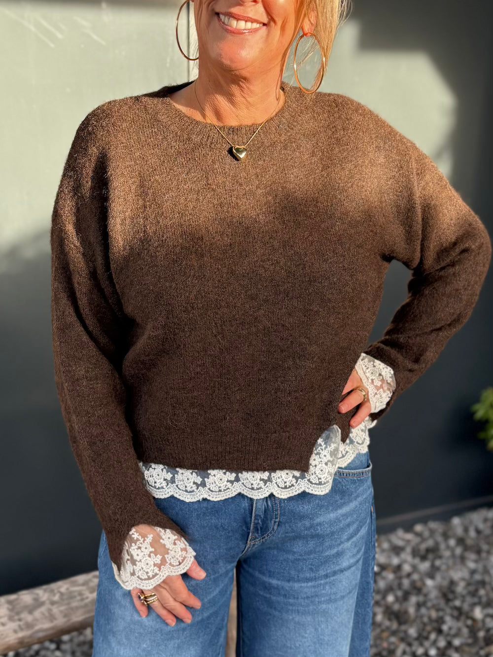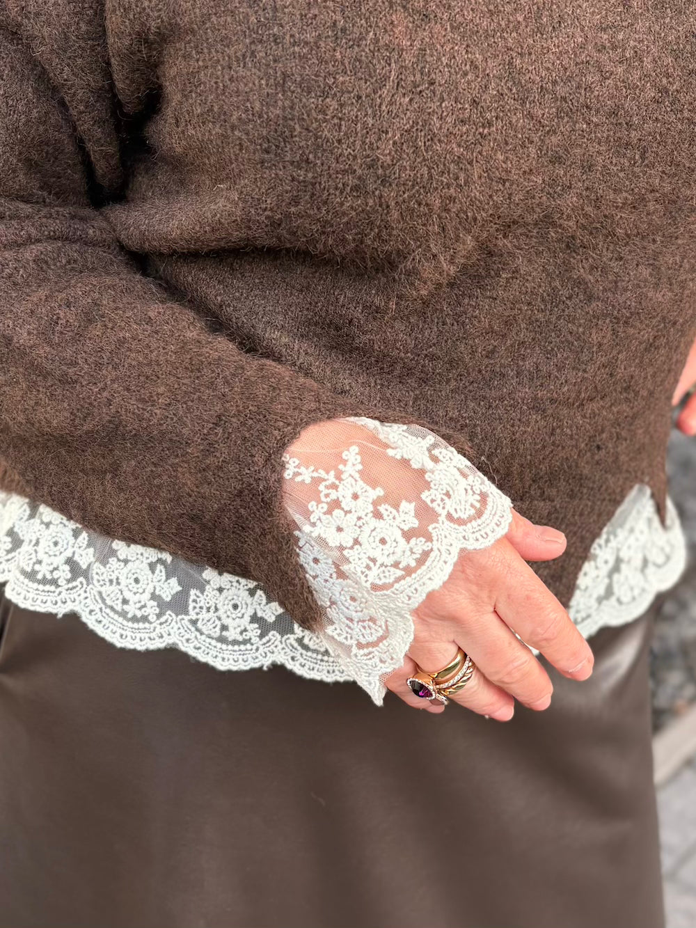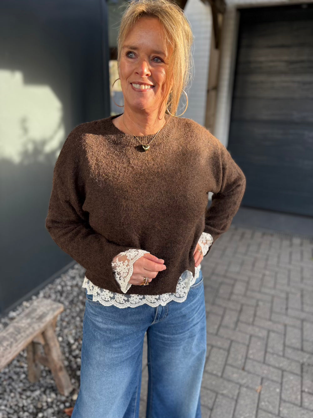 Wil je een echte eyecatcher? Dan is deze trui echt iets voor jou. Deze mooie trui heeft kanten details aan de mouwen en onder aan het boord zodat het net lijkt alsof je er een kanten blouse onder draagt. Deze vrouwelijke en feestelijke trui draag je op een rok maar je kunt deze natuurlijk ook casual dragen.