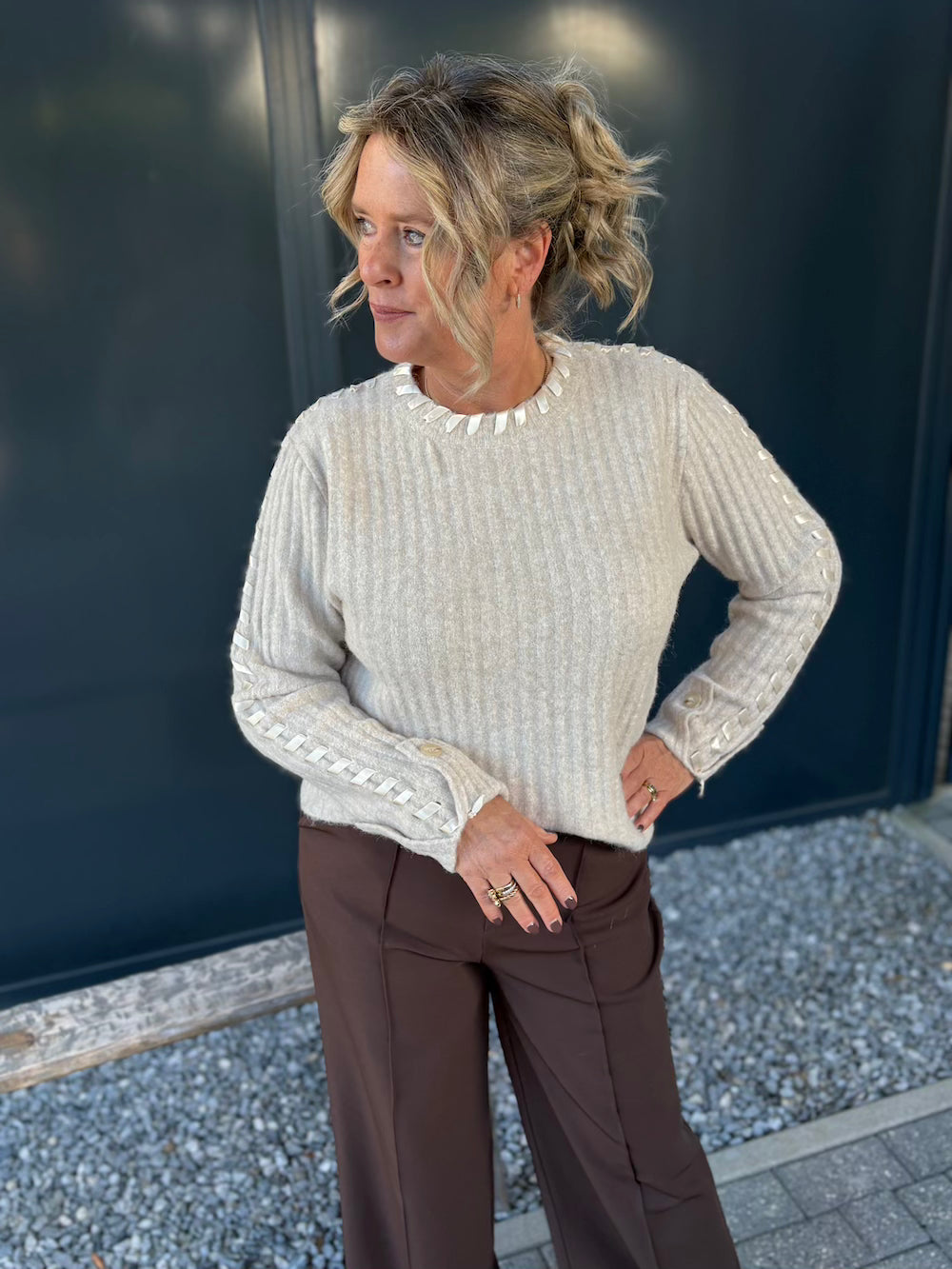 Deze trui heeft een lint door de halslijn en de mouw geweven voor een mooi effect. Het maakt van deze trui toch een trui met een beetje extra. De trui is van dun gebreidt materiaal en kan eindeloos gecombineerd worden.