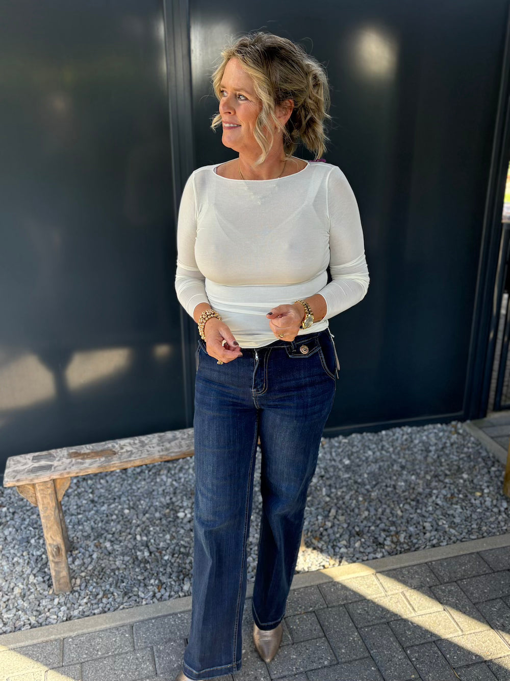 Dit is een ideaal truitje om ergens onder te dragen, het is gemaakt van dun materiaal en een percentage kasjmier. Het stretcht lekker mee en het is fijn als basic onder je blazer of gilet nu blote armen misschien te fris worden.