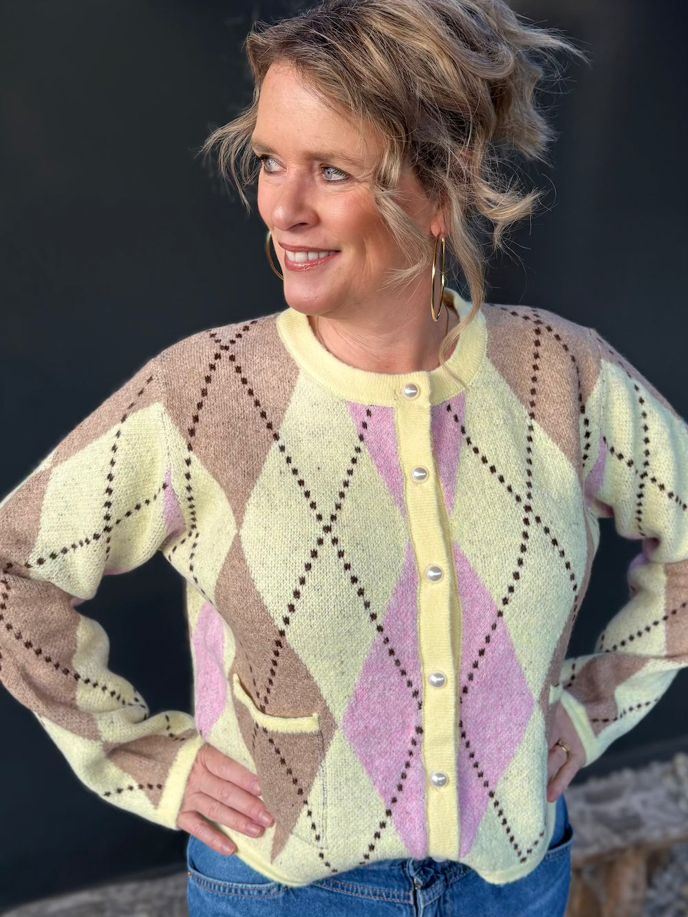 De trend van dit seizoen de ruit ofwel argyle genoemd. In de nieuwste kleuren combinaties en toch nog lekker warm om te dragen als het fris is. Dit geweldige vest sluit met mooie parelknoopjes en heeft een ronde hals. Qua lengte valt dit vest net tot op je tailleband maar is lang genoeg om er een beetje in te stoppen.