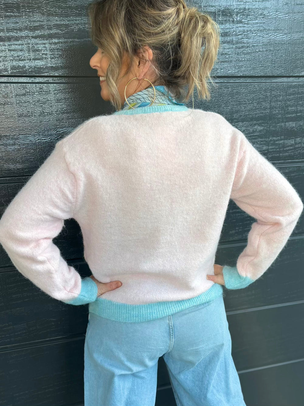 Vestje roze met blauwe bies