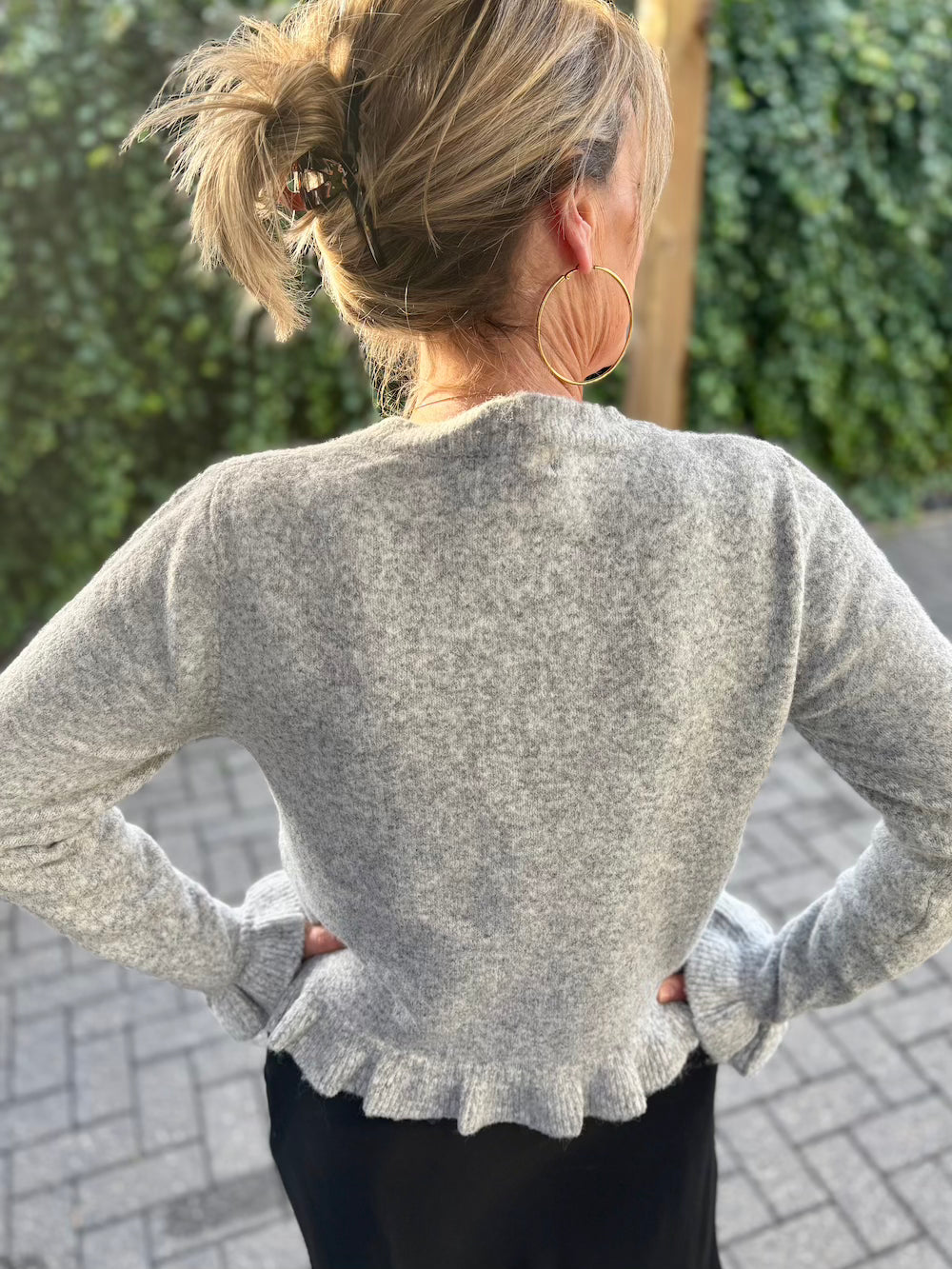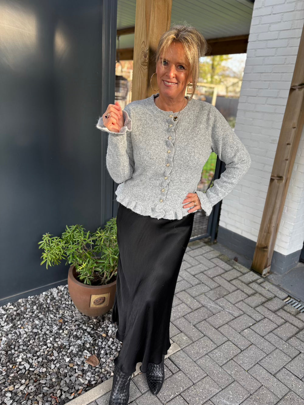 Wauw! Wij zijn sowieso fan van vestjes maar dit vestje heeft leuke ruches langs de knoopjes en het hele boord èn aan de manchet. De knoopjes geven het wauw effect door de vorm en het mooie gouden randje en de zachte kleur.